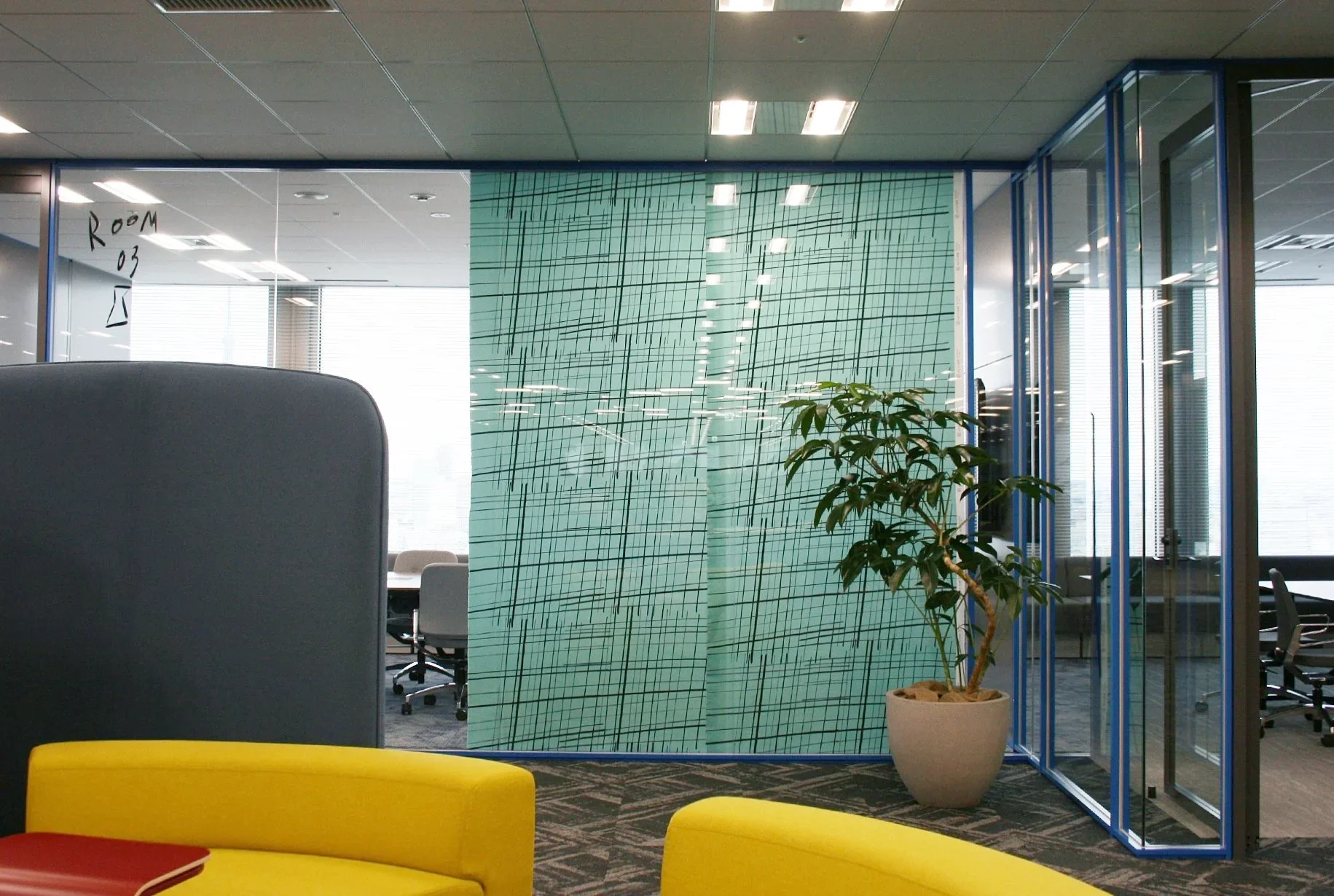 さらに、ASENDADAのテキスタイルを主要な会議室に合わせてタペストリー化し、プライバシーに応じて可動できるよう施工しました。