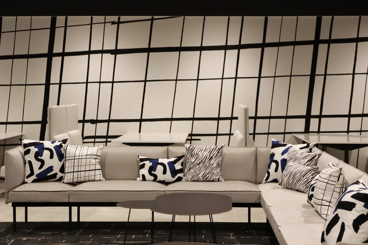 The entrance and corridor walls were painted with the archive design Plaid White. The pillars in each office area were designed and finished with custom wall coverings, while the meeting rooms featured original hand-drawn graphics painted directly onto the walls.